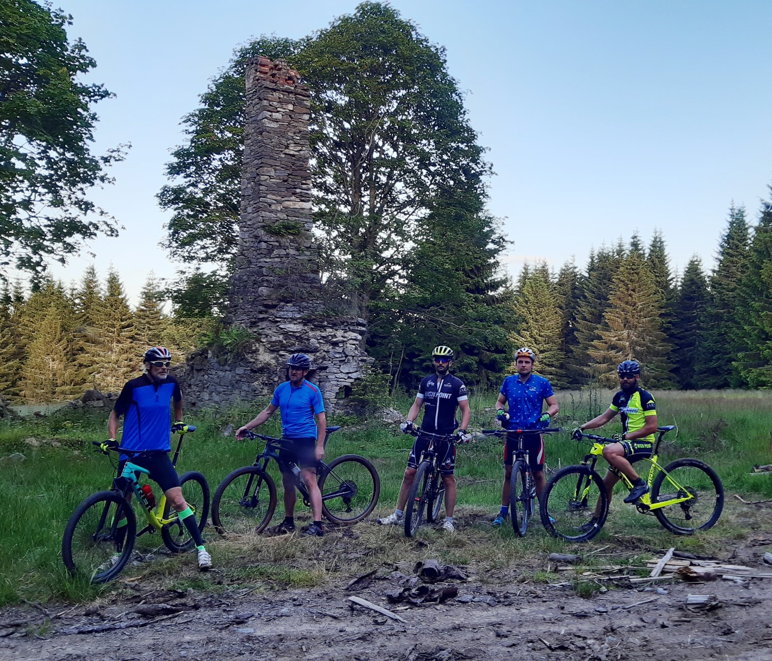 Někteří jsou po úterním výletu a pivním návratu vlakem krapet zdrchaní. Sjedem se jen v šesti, ale zas je skupina vyrovnaná výkonnostně a nikde se nečeká a jízda odsýpá. Projedem luhem, Dl ves a vyhoupnem Mouřenek. Pak do Rejna a kus po asfaltu při Losenici až na červenou cestu na Popelnou. Zdoláme technický výjezd k Popelné a pak jdem na ještě techničtější úsek dál proti proudu Losenice. Jde to dobře, jen na jednom úseku probíhá těžba a musíme ze sedel. Ale úsek je to pěknej a snažíme se ho zdolat bez ztráty kytičky, tedy bez šlápnutí na zem. Pak stoupáme dál po lesní cestě směrem na Zlatou Studnu, ale končíme u Matesa. Foto a jedem na cestu Danielku, na Zhúří a na Huťskou horu 1187. Stavíme se na Klostermannově lavičce s výhledem na Roklan a pak už vzhůru dolů do Rejna. Dlouhý sjezd s 600m klesáním z 18C do teplejších nížin. Sjíždíme po zelený korytem na Flusárnu, Kozí hřbety a kolem rozvaděče po loukách přímo do Rejna na náves. Pak po stejné cestě přes Mouřenek. Na vršku se mi jede divně a koukám, že mám skoro prázdný přední kolo. Nechce se mi měnit, tak dojíždim na plavoucím řízení. Ed ještě předvede artistickou vložku při seskoku mezičky ve vsi, tlumič jde na doraz a on skoro k zemi. Na staďáku se žízeň hasí, jen DaVe si odjíždí do Rabí pro jeho letos nejdelší trip.